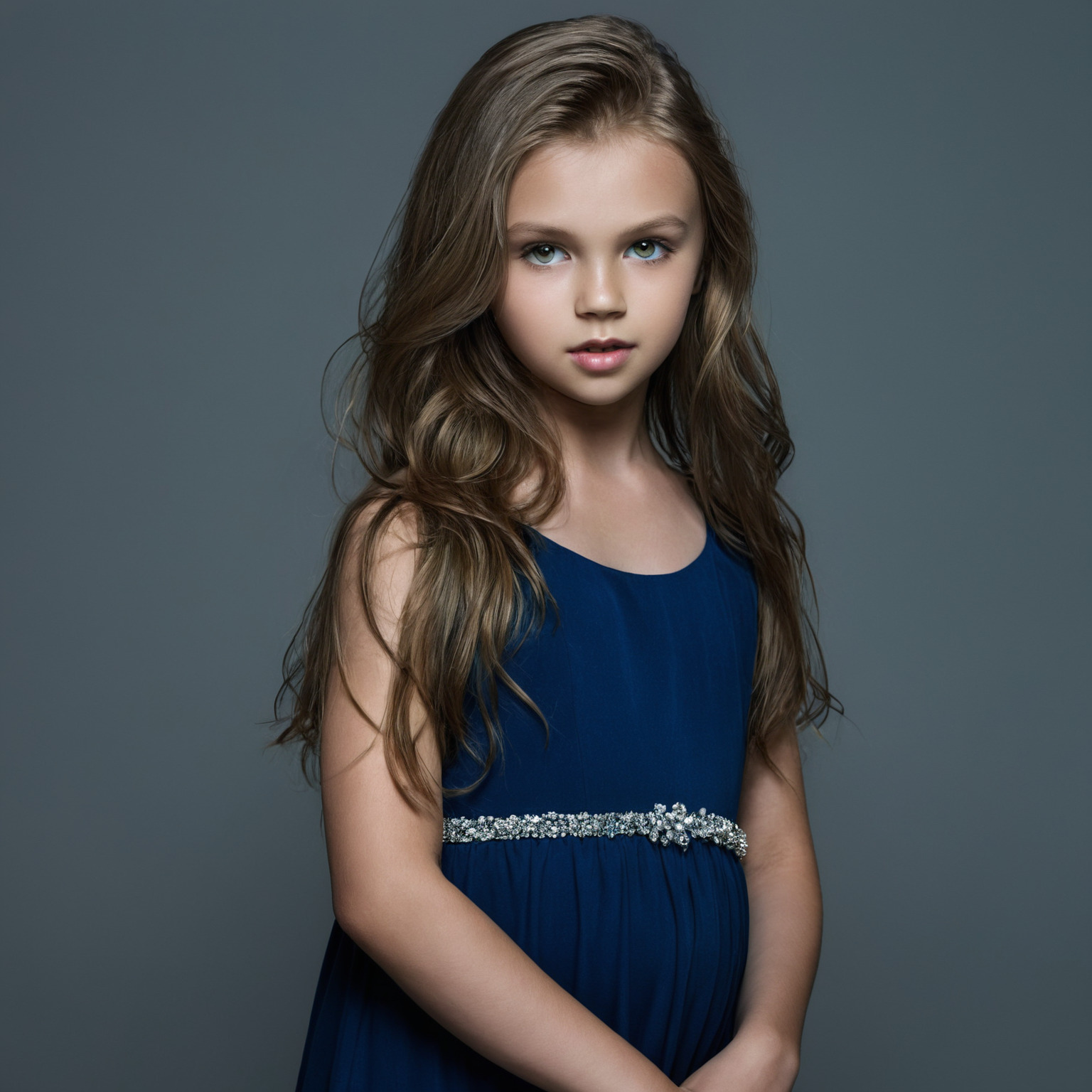 Artistic photo of a beautiful little girl. Professional upper body shot of a cute AIDA_XLLR_PoliAn with long falling hair, she is wearing a blue dress. Ten years old girl with pretty face and smooth skin. She is in playful and relaxed mood. Closed mouth. Pretty symmetrical face with big beautiful green or yellow eyes and long elegant eyelashes. Dark eyes. Make up. Dramatic colorful light, blue key light and yellow fill light creating a balanced exposure. Clean, black background, 85mm lens for a natural look, confident stance, looking directly at the camera, depth of field.