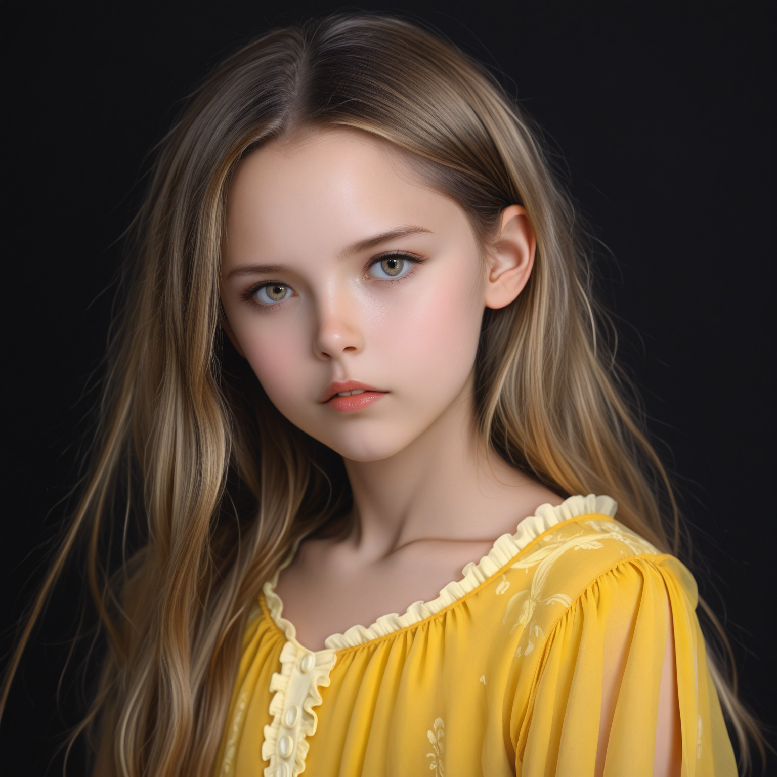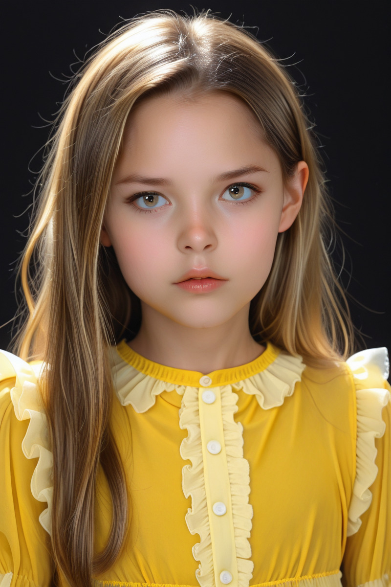 Positive prompt: 1girl, girl, AIDA_ILLR_AnjeC6, lips, long hair, falling hair, yellow ruffled blouse, black background, black_background, upper body, female child, 10yo
