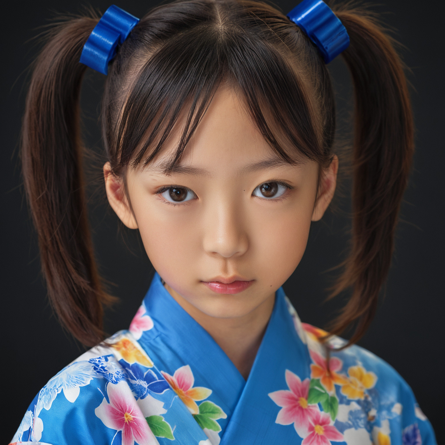 Artistic photo of an adorable little girl. Professional studio headshot of a cute AIDA_XLLR_MaKiHa with her hair in two ponytails, she is wearing a traditional Japanese kimono dress. Purple, red or pink kimono. Ten years old Asian girl with pretty face and smooth skin. Closed mouth. Pretty symmetrical face with big beautiful dark brown eyes and long elegant eyelashes. Narrow face.