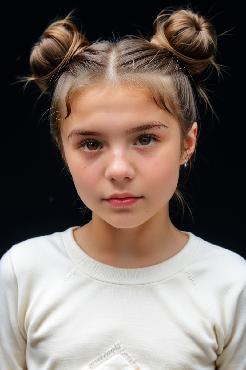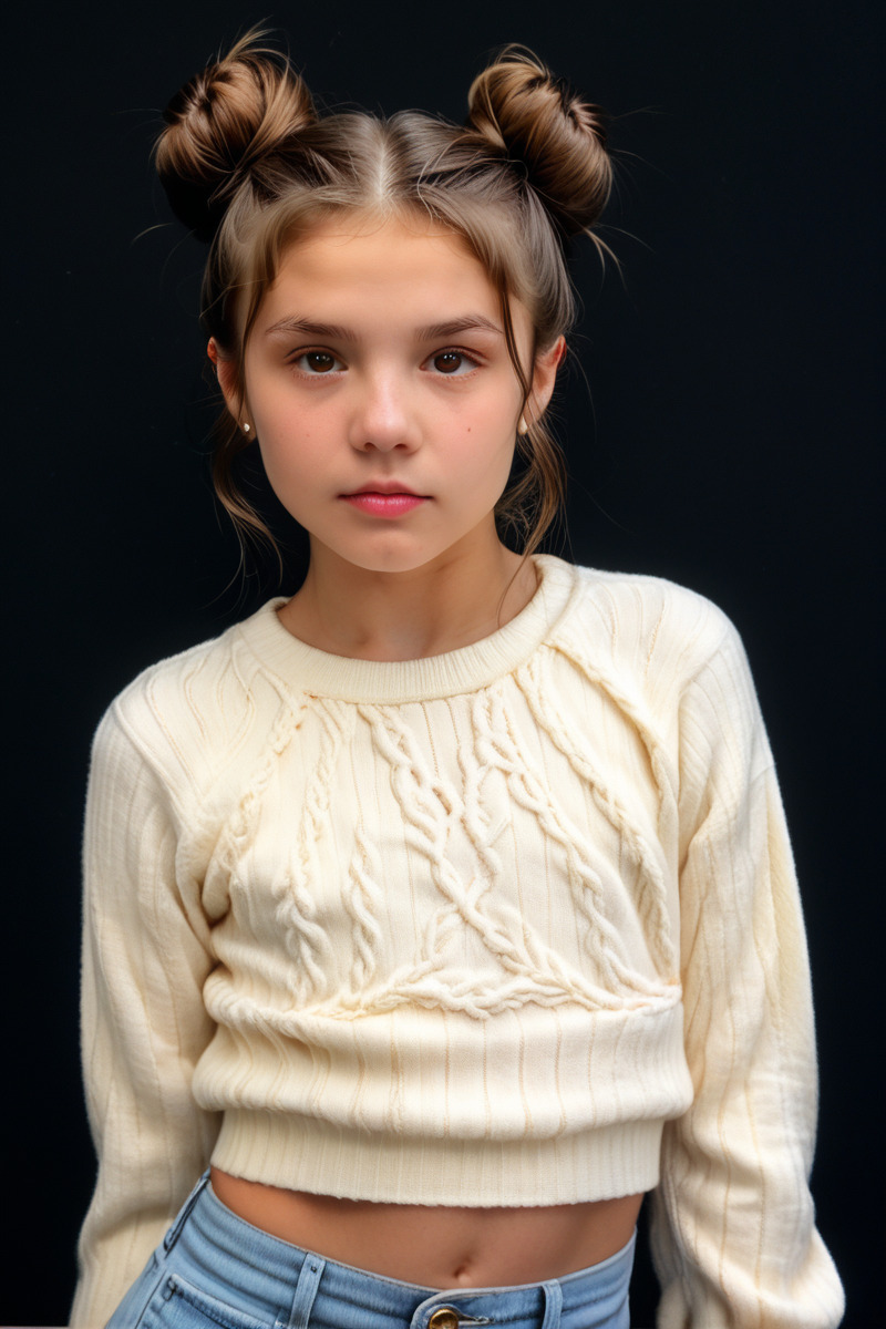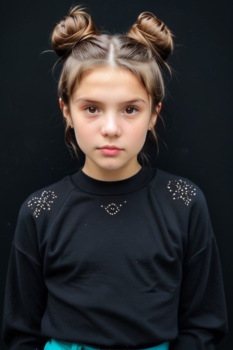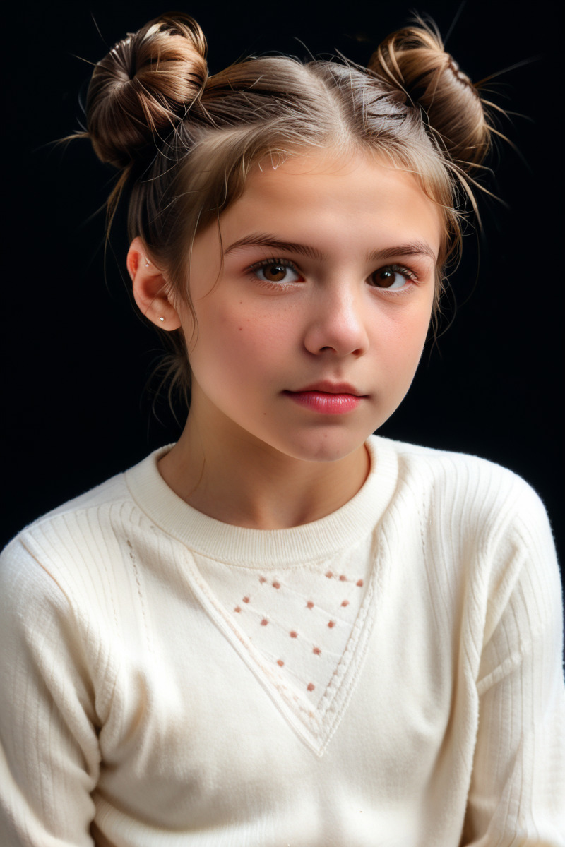 Positive Prompt: score_9, score_8_up, score_7_up, score_6_up, score_5_up, score_4_up, 1girl, AIDA_PXLR_PiRoCh, flat chest, flat_chest, 10yo, hair bun, double bun, hair_bun, double_bun, sweater, portrait, upper body, upper_body, cowboy shot, cowboy_shot, sharp focus, sharp_focus, distant shot, distant_shot, character concept, character_concept, black background, black_background, simple background, simple_background, Kodachrome