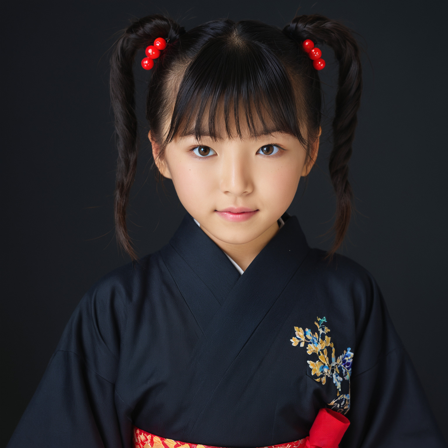Artistic photo of an adorable little girl. Professional studio headshot of a cute AIDA_XLLR_SeGoTo with her hair in two ponytails, she is wearing a traditional Japanese kimono dress. Purple, red or pink kimono. Ten years old Asian girl with pretty face and smooth skin. Closed mouth. Pretty symmetrical face with big beautiful dark brown eyes and long elegant eyelashes.